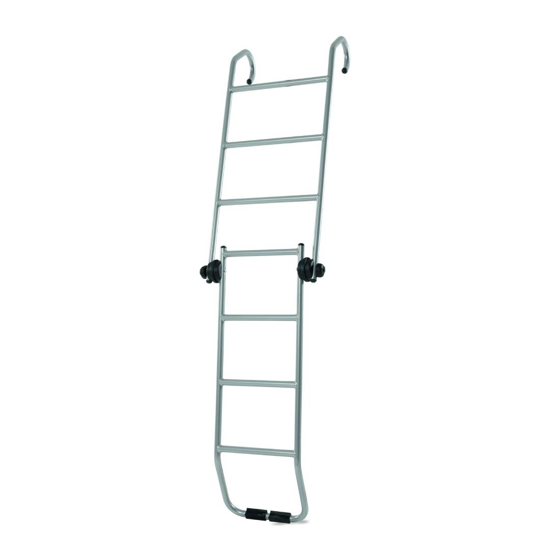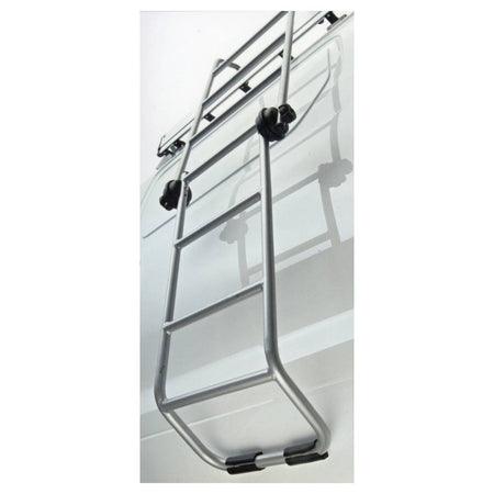 سلم متحرك قابل للطي مصنوع من الفولاذ المطلي بالبودرة باللون الرمادي المعدني، مزود بدعامات مطاطية مقاومة للخدش. مناسب لحوامل أسطح المركبات التجارية من بارو.