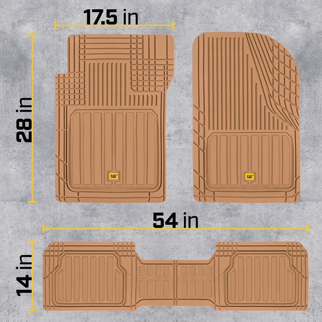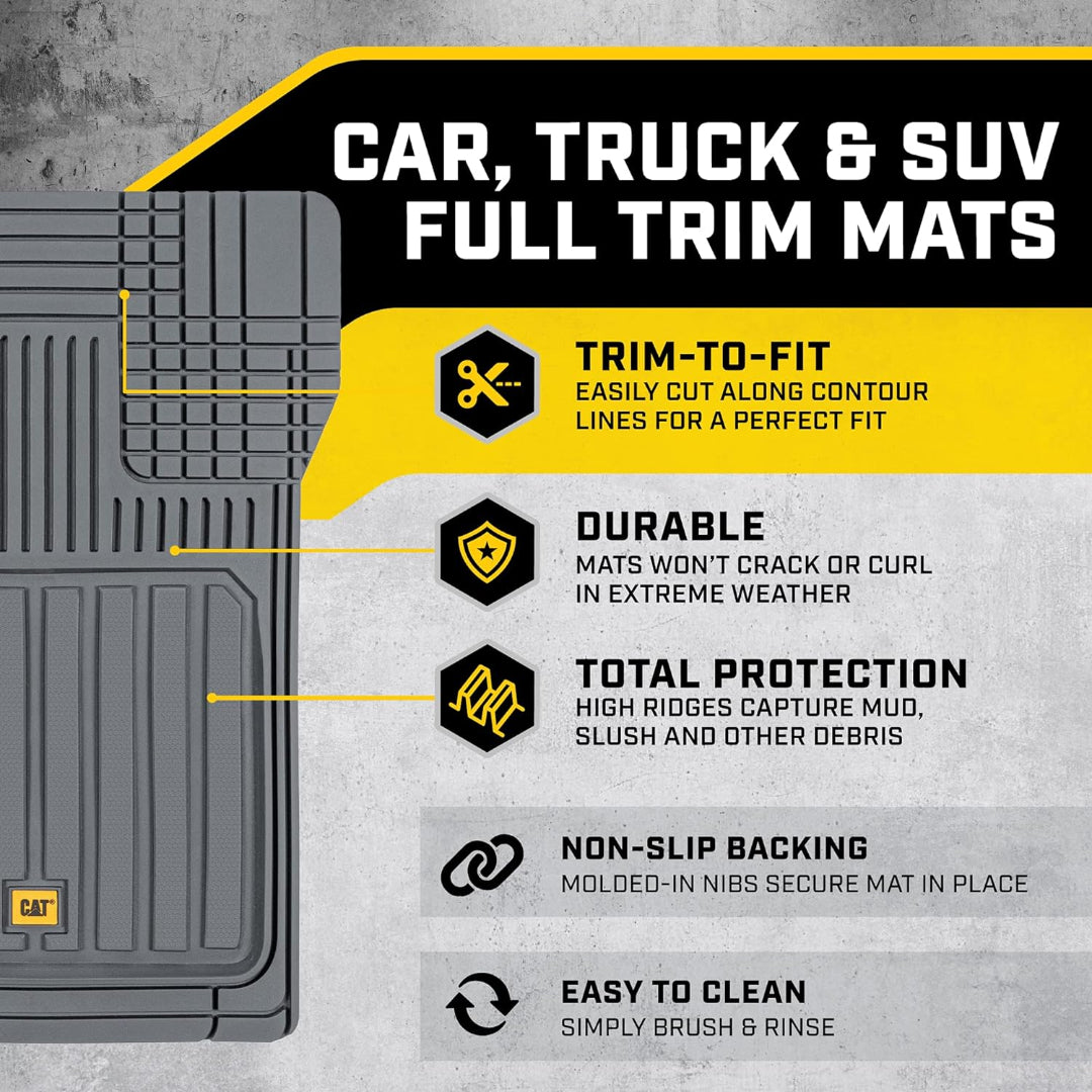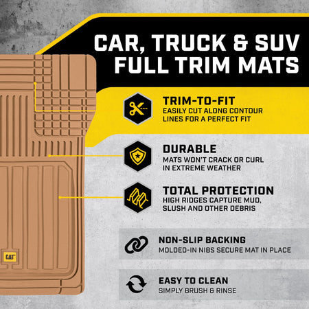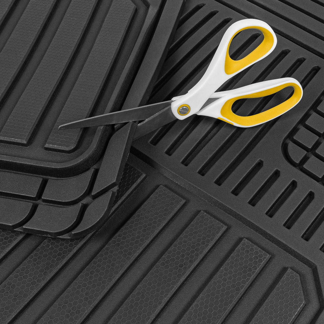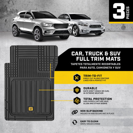 صُممت هذه السجادات من حيث الشكل والحجم لتناسب معظم السيارات والشاحنات والشاحنات الصغيرة وسيارات الدفع الرباعي. صُممت لتتناسب مع منحنيات أرضية سيارتك بمقص فقط. لا داعي لإرهاق ظهرك بحشو السجادات لمجرد ملاءمتها. ما عليك سوى قص الخطوط حتى تجد المقاس المثالي. تتميز هذه السجادات بتصميم فريد، خطي وقطري، موزعة بشكل استراتيجي داخل الصفيحة العميقة لتعزيز قدرتها على احتجاز الماء والثلج والطين والحطام، ولن تتسرب من خلالها إلى داخل السيارة. أبعاد المنتج (الأمامي: ٤٤.٥ سم × ٧١.١ سم / الخلفي: ١٣٧.٢ سم × ٣٥.٥ سم).