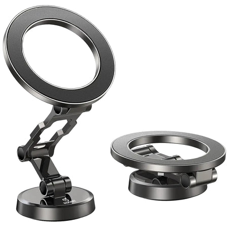 تصميم قابل للطي ثنائي المحور: يحتوي الحامل على مفصلتين منفصلتين. يتيح لك ذلك ما يلي: - رفع الهاتف فوق لوحة القيادة. - مده للأمام باتجاه عجلة القيادة. - طيه بشكل مسطح على لوحة القيادة بحيث يكون شبه مخفي عند عدم استخدامه.