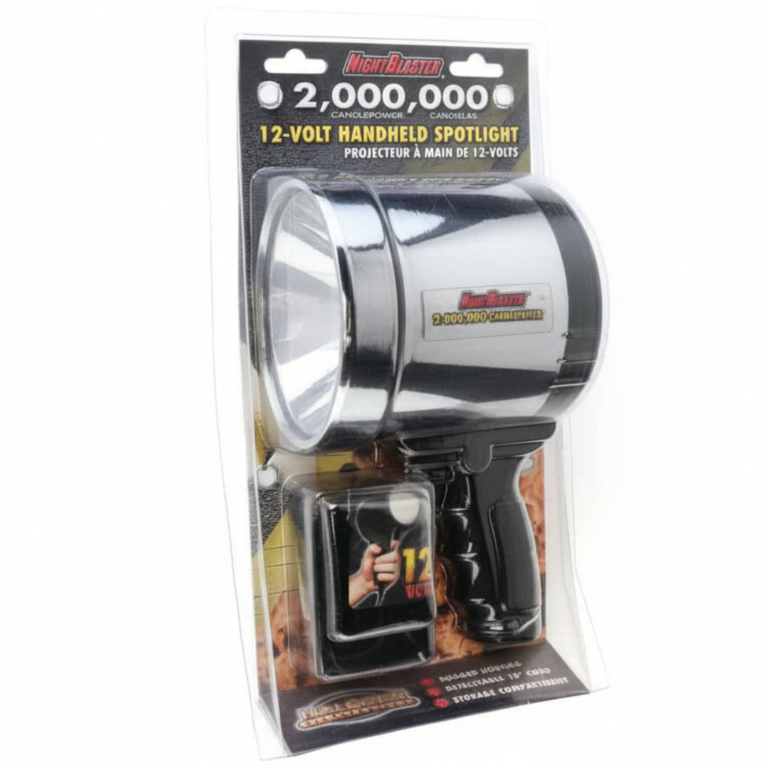 كشاف ضوئي بقوة ٢,٠٠٠,٠٠٠ شمعة، يعمل بجهد ١٢ فولت. مزود بتقنية مصباح زينون جديدة بقوة ١٠٠ واط. سلك حلزوني قابل للفصل بطول ٣ أمتار مع حجرة تخزين عملية. مفتاح تشغيل. لون أسود.