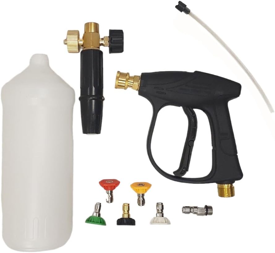 يعد طقم مسدس الغسيل بضغط عالٍ أداة تنظيف فعالة ومناسبة للسيارات والباحات والاستخدام المنزلي العام. يأتي مع خمسة رؤوس فوهات سريعة التوصيل مرمزة بالألوان، مما يتيح سهولة تعديل نمط الرش لمهام التنظيف المختلفة.