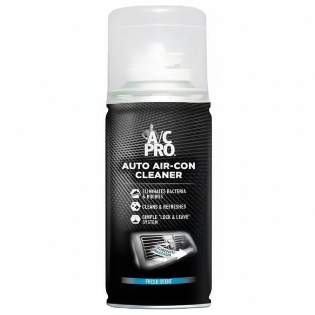 AC Pro Car Air Conditioner Cleaner helps remove bacteria buildup that causes bad odours and weak airflow. It cleans, disinfects, and refreshes the entire A/C system in just 10 minutes. The product uses a simple “lock and leave” application method. To use it, shake well, run the A/C on full internal circulation, place the can behind the front passenger seat, and activate it. After the can empties, turn off the engine and ventilate the vehicle thoroughly.