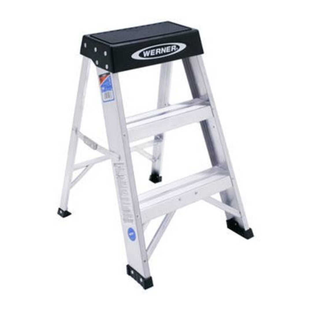 The Werner Aluminum Step Stool is a lightweight, durable tool with a heavy-duty industrial rating of 300 pounds (Type IA), ideal for tasks around the home or job site. It features slip-resistant Traction-Tred steps and Pinch-Proof spreaders for safety and a large top platform for comfort