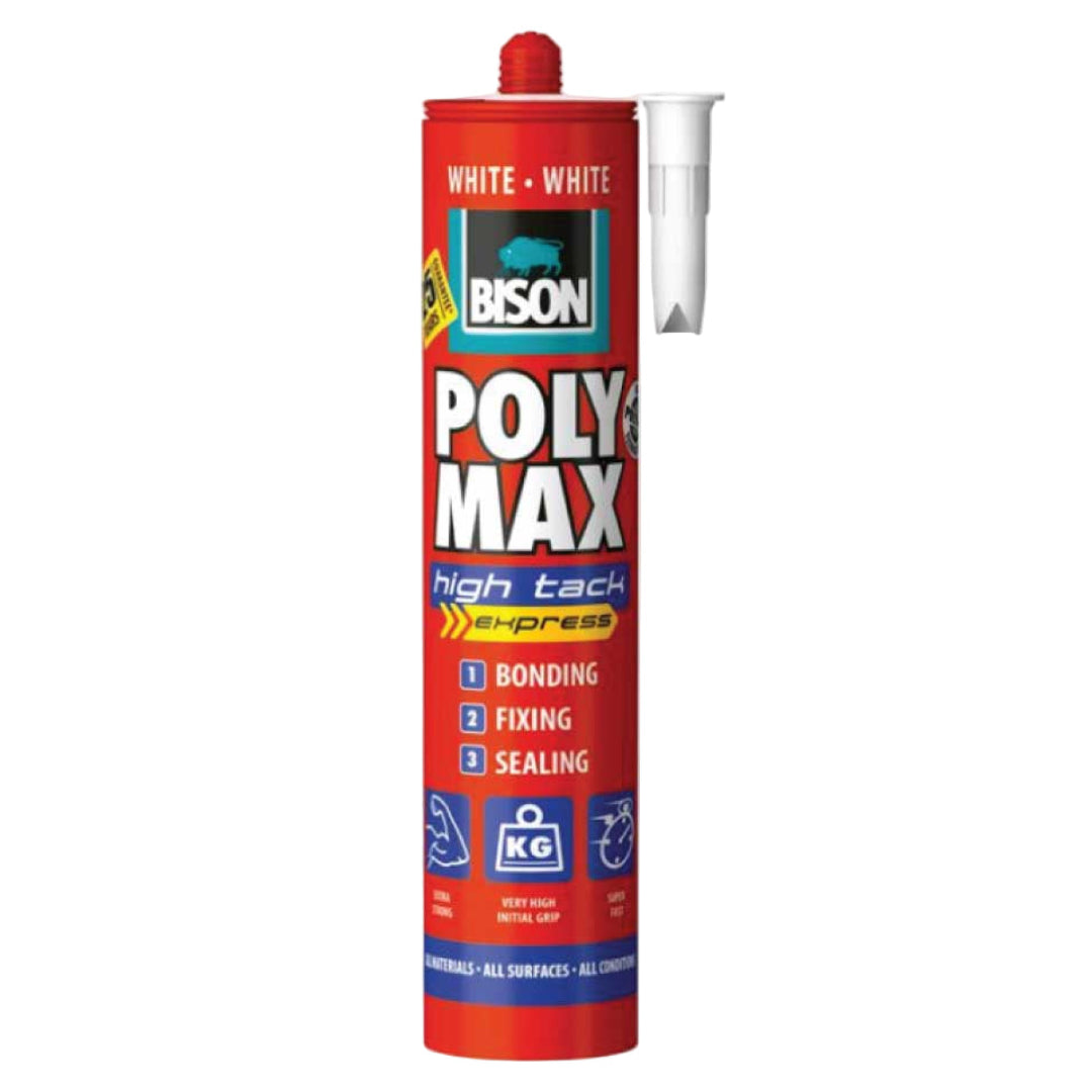 Bison Poly Max High Tack Express Cartridge 425 g is a high-performance adhesive with very high initial and final bond strength, perfect for both indoor and outdoor use. It bonds to slightly damp surfaces without primer, is permanently elastic, and resistant to temperatures from -40 °C to +100 °C, as well as UV, water, and all weather conditions. Acid-free, odorless, and 100% adhesive, it provides fast, durable, and reliable bonding for a wide range of materials.