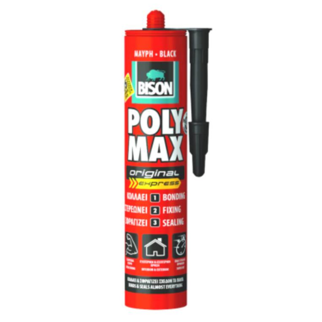 Bison Poly Max Original Express Black 425g is a high-performance, super-fast adhesive for both indoor and outdoor use. It provides very strong, permanently elastic bonds with excellent filling capacity and works on slightly damp surfaces without primer. Resistant to temperatures from -40 °C to +100 °C, as well as UV, water, and all weather conditions. Paintable (test first), solvent-free, acid-free, and odorless, it ensures durable and reliable bonding for a wide range of materials.