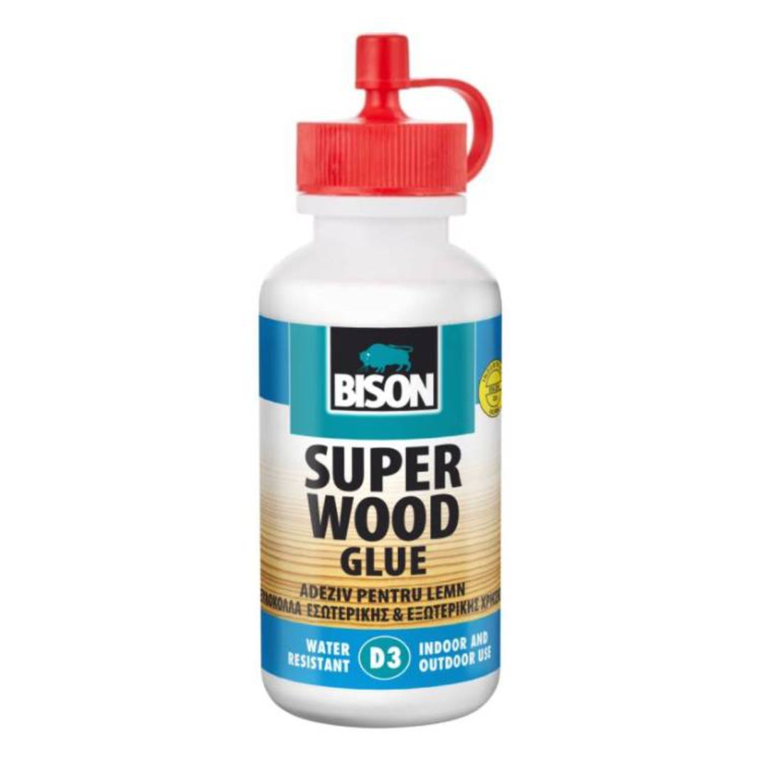 Bison Super Wood Glue is designed for strong and reliable bonding in both indoor and outdoor wood applications. It should be applied at a minimum temperature of +5°C, with relative humidity up to 65% and wood moisture content between 8% and 12%. After applying a thin, even layer, the bonded parts must be pressed or clamped for 30–60 minutes using a pressure of 2–5 kg/cm to achieve optimal strength. The product comes in a 75 g pack, is water-resistant (EN 204 D3), solvent-free, paintable, and dries transparent for a clean finish.