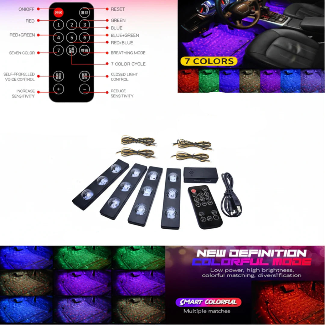 Voice Control + Remote Control. This upgraded interior lighting kit features four high-brightness LED modules that create a vibrant starlight atmosphere on the car's floor. It supports multiple modes including voice control, breathing effects, and music synchronization via a wireless remote for a customized driving experience.