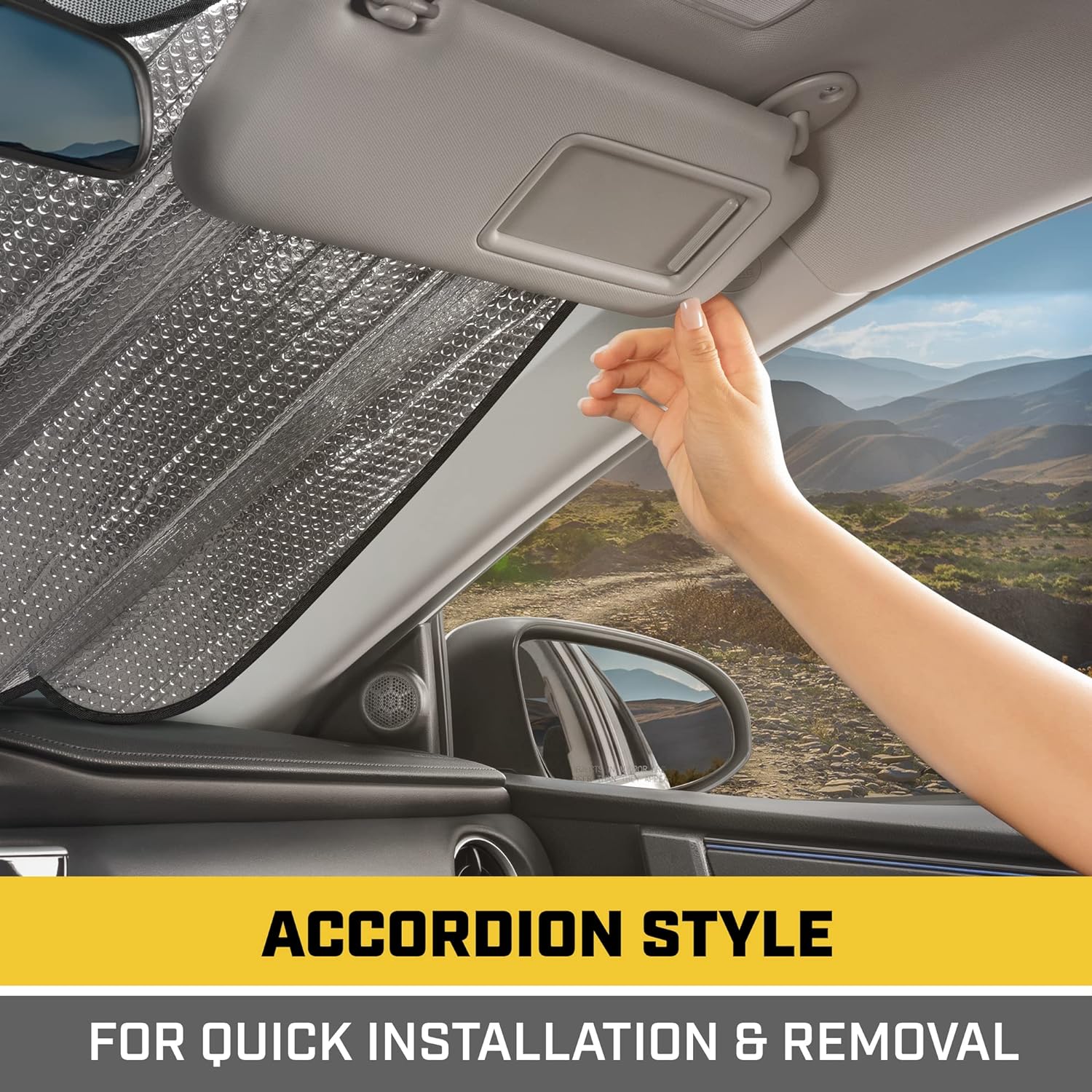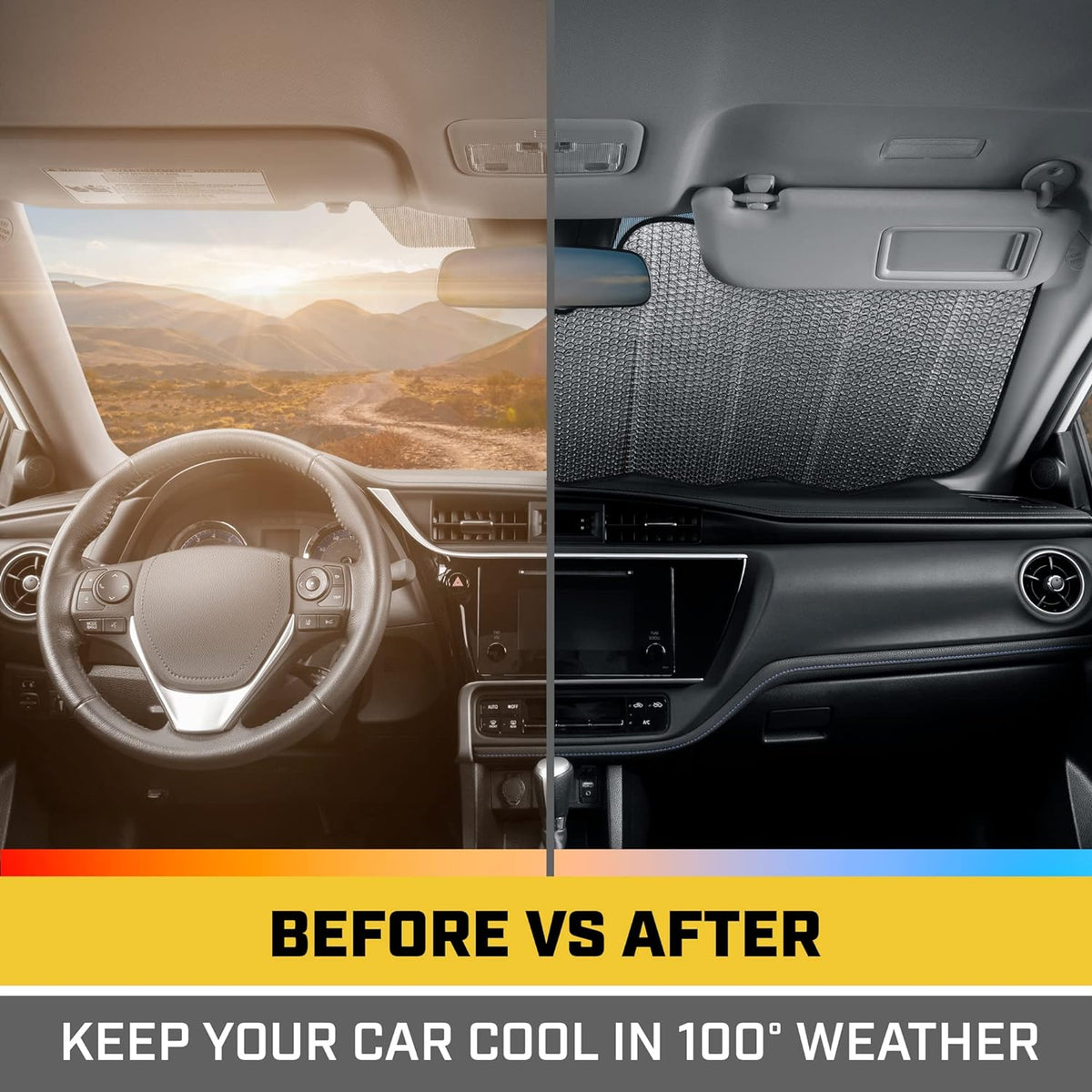 COMFORTABLE COOL INTERIOR -On a typical sunny day, avoid the extra heat and keep your interior cool with our top quality Windshield Sunshade Protector. Reduces interior car temperatures by 30-50 degrees which increases the lifespan of your vehicle's dash surface, radio, LCD Screen, GPS Devices and other electronics. Dual-Layer Bubble design for maximum protection for your vehicle's interior, keeping your seats and steering wheel cool by blocking the sun's heat and harmful UV radiation rays. The foldable accordion design allows you to prop the sunshade up with ease and fold-away storage with a velcro closure. It can also be reversed and used on both sides with the same protection! TOP QUALITY FITMENT - Size: 57" Width x 27" Height. Universally made for most personal vehicles and fits the windshield using the rear-view mirror as support. The tapered edges allow for a more snug fit.