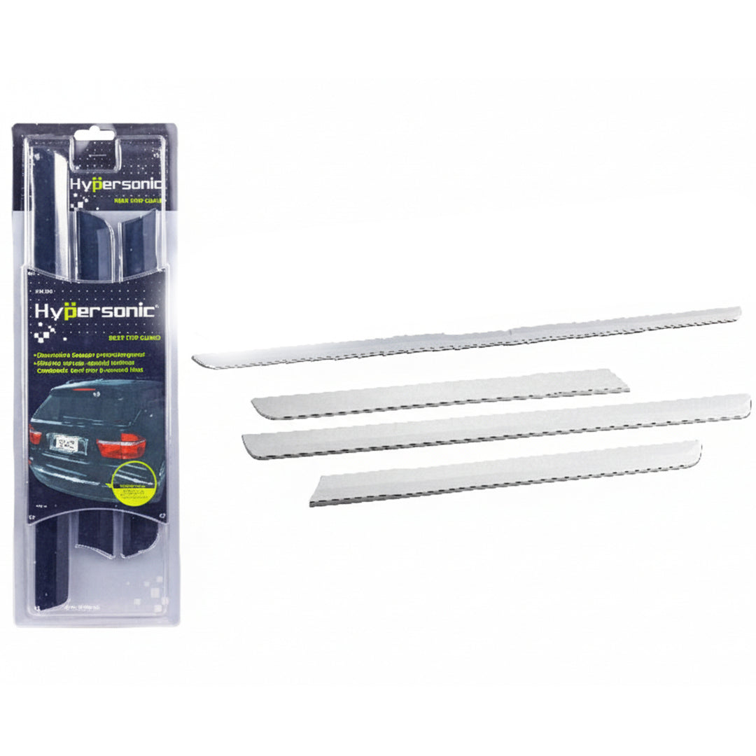 The Hypersonic HP-6183 is a 3-piece decorative guard made from scratch-resistant ABS material with a platinum chrome finish. It is designed to protect the rear bumper step from minor scuffs or collisions when loading items into the trunk.