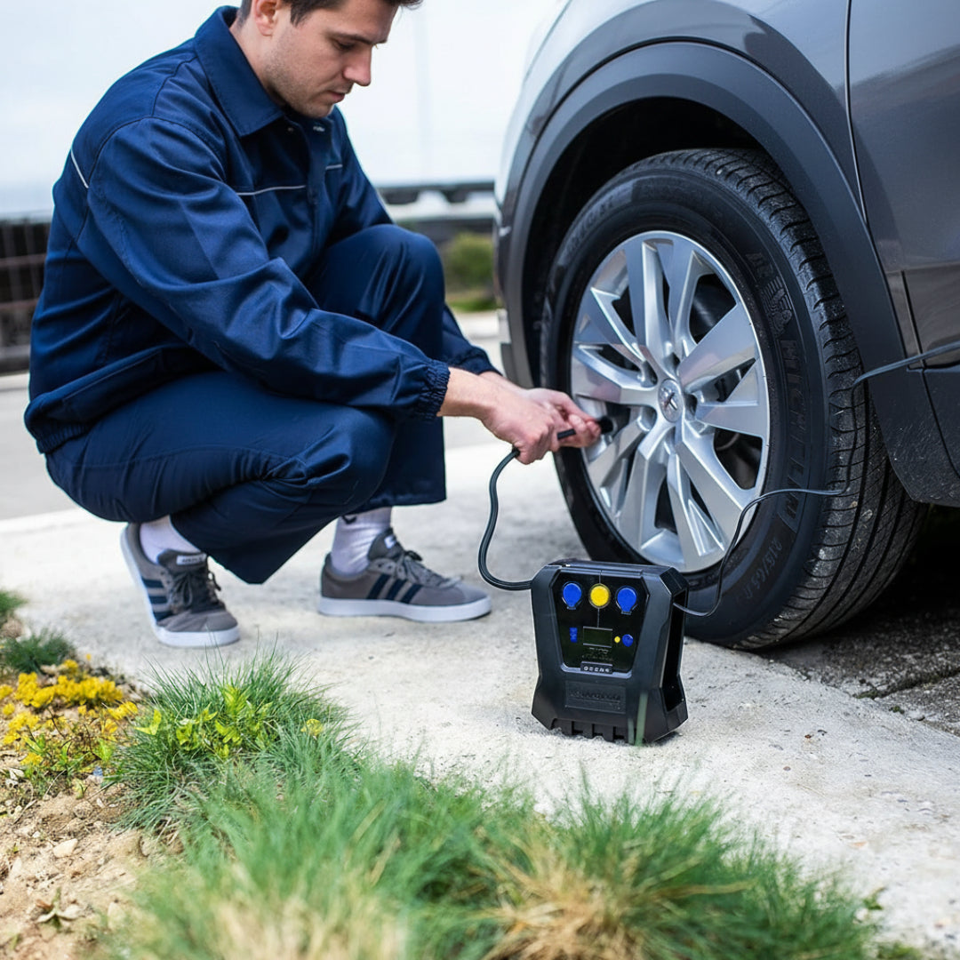 Max pressure: 50 PSI for car tyres (100 PSI for cycle tyres).
