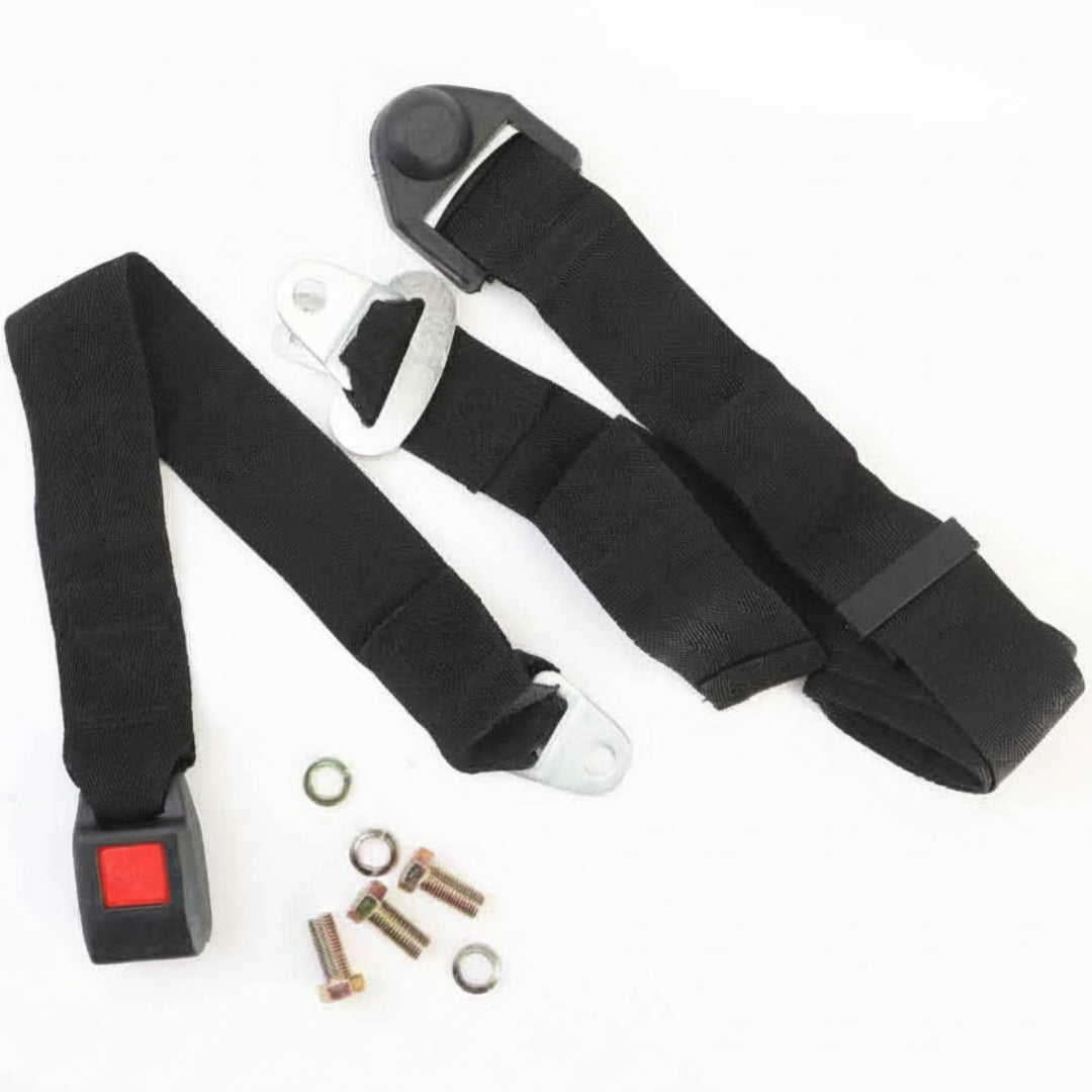 The total length of the woven belt is about 125.9inch. 1.8inch wide and 0.04inch thick. Extra long adjustable straps for better fit any size driver.Fits for all vehicles such as Golf cart or go kart, Club Car, Buggies, Truck, Bus.The belts are made from high-quality ABS Polyester; The safety belt latch is made from steel. Tensile strength, high safety factor.Fully adjustable hardware with quick release camlock. Provide added safety in driving, by being firmly secured in the seat.PACKAGE INCLUDED: 3 Point Seat Belt Lap; Diagonal Belt x 2