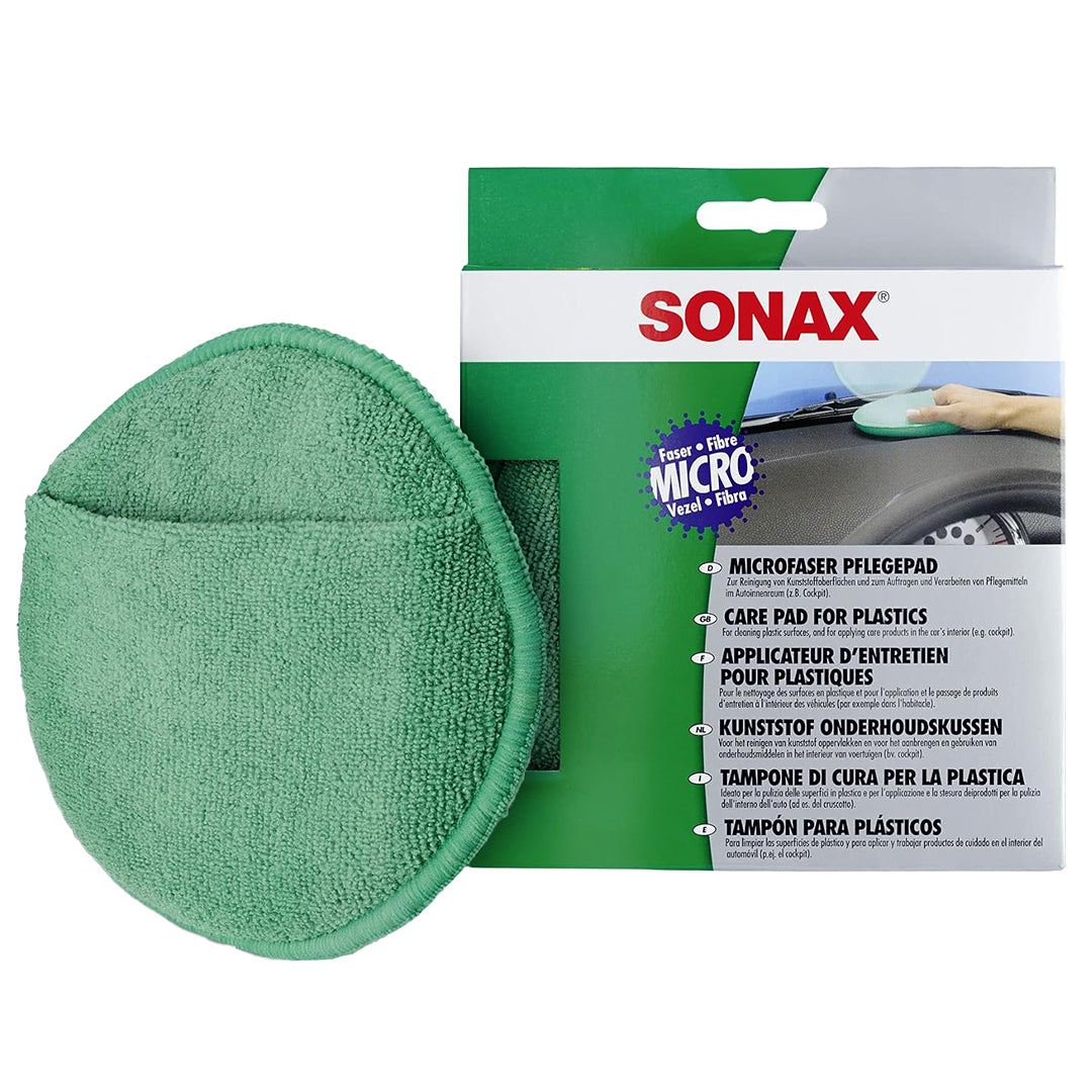 The Sonax Care Pad For Plastics is a high-quality microfiber applicator designed for applying care products and cleaning various plastic surfaces within a vehicle's interior. Its fine fiber structure ensures an even, smooth application of creams or gels without leaving streaks or excess residue. The ergonomic design makes it easy to handle, providing a professional finish on dashboards, trim, and consoles.