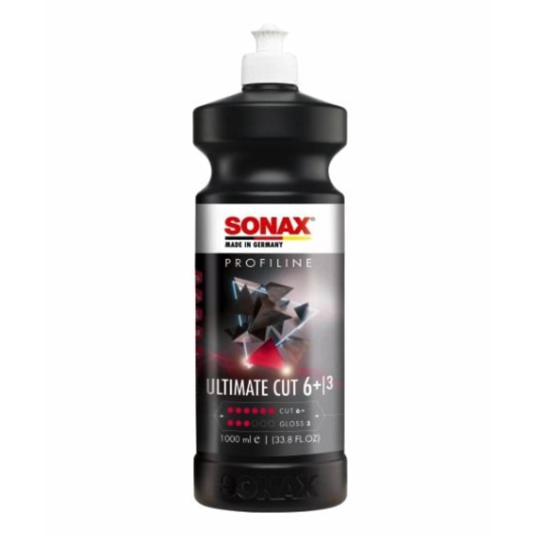 SONAX PROFILINE Ultimate Cut 6+|3 is a high-performance, professional-grade abrasive compound engineered for maximum speed and efficiency in removing deep scratches, severe oxidation, and sanding marks as coarse as P800 on rotary machines or P1000 on dual-action polishers. Formulated with ultra-pure, extremely hard aluminum oxide and utilizing Diminishing Abrasive Technology (DAT), this water-based, silicone-free compound offers an exceptionally wide processing window that stays "open" longer without drying out, while its specialized Low Dust Technology ensures a clean workspace and effortless residue wipe-off. Designed for use on all automotive clear coats, fresh paintwork, and large surfaces like gel coats or fiberglass, it achieves an industry-leading 6+ cut rating while still refining to a respectable 3-level gloss, making it an ideal first step for heavy paint correction that prepares the surface perfectly for a final high-gloss finish.