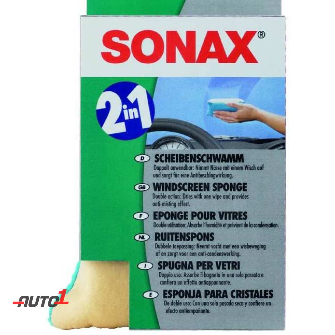 SONAX Windshield Sponge has a yellow side to quickly absorb moisture and a blue side to add a lasting defogger effect!