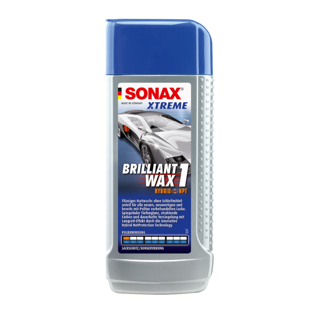 Sonax Xtreme Brilliant Wax 1 Nano Pro is a premium liquid wax engineered for brilliant shine and durable protection using advanced nano-technology. This innovative formula features microscopic wax particles that penetrate deep into the paintwork structure, providing a smooth, high-gloss finish that lasts. It offers superior protection against environmental damage, UV radiation, and road grime, creating a resilient hydrophobic barrier that repels water effectively. Designed for both new and well-maintained vehicles, this product is easy to apply and buffs to a streak-free, intense shine, ensuring professional results with minimal effort.