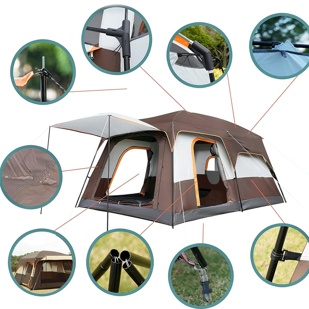 This large family cabin tent measures 430 x 305 x 203cm and is designed to comfortably accommodate 8 to 12 people. It features a double-layer design with two partitioned sleeping areas, is waterproof and wind-resistant, and comes equipped with an outer curtain design for a natural outdoor living space.
