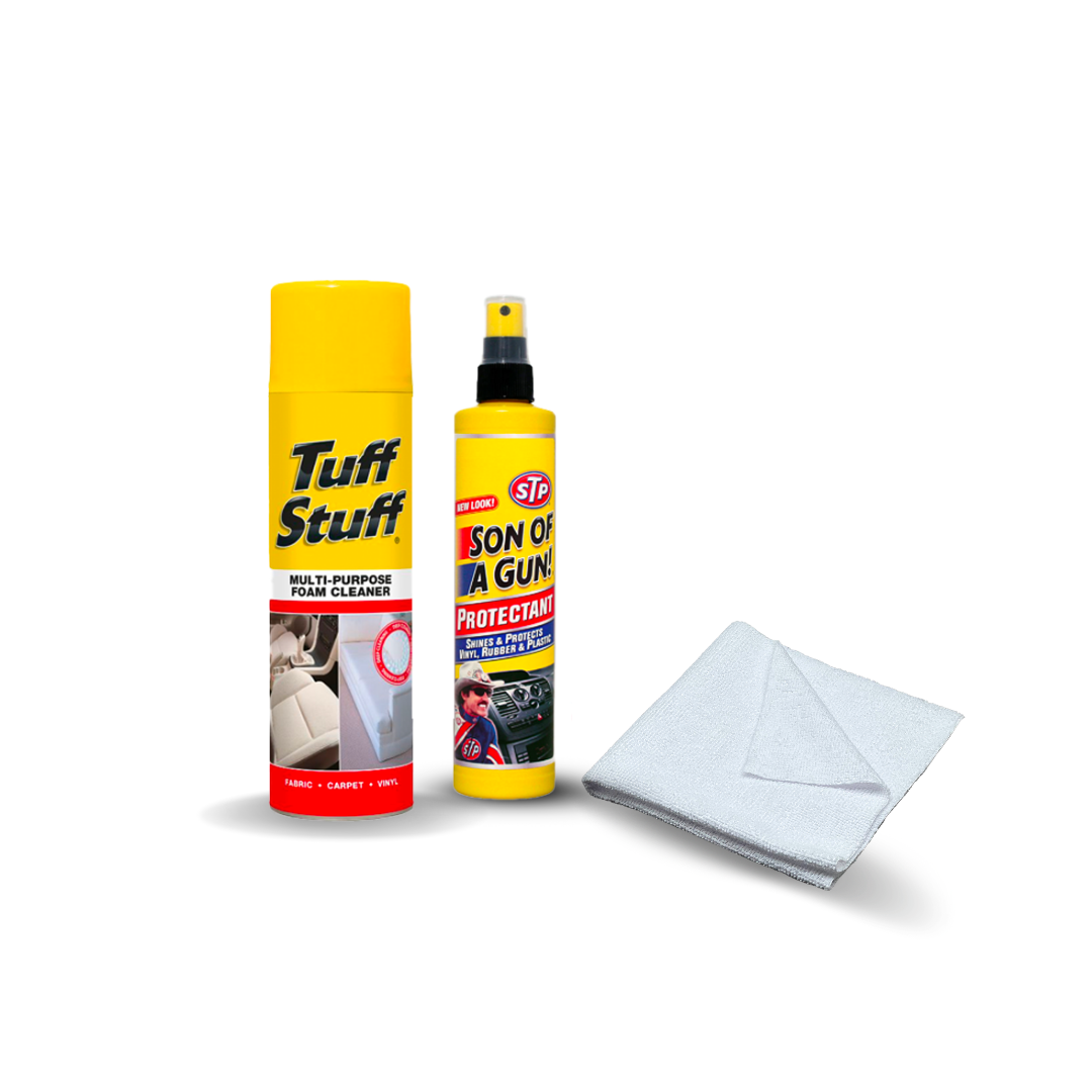 This bundle combines the powerful Tuff Stuff multi-purpose foam cleaner for fabric and vinyl with STP's Son of a Gun protectant for rubber and plastic surfaces. It offers a complete solution for cleaning automotive interiors, ensuring both deep cleaning and a protective, new look finish.